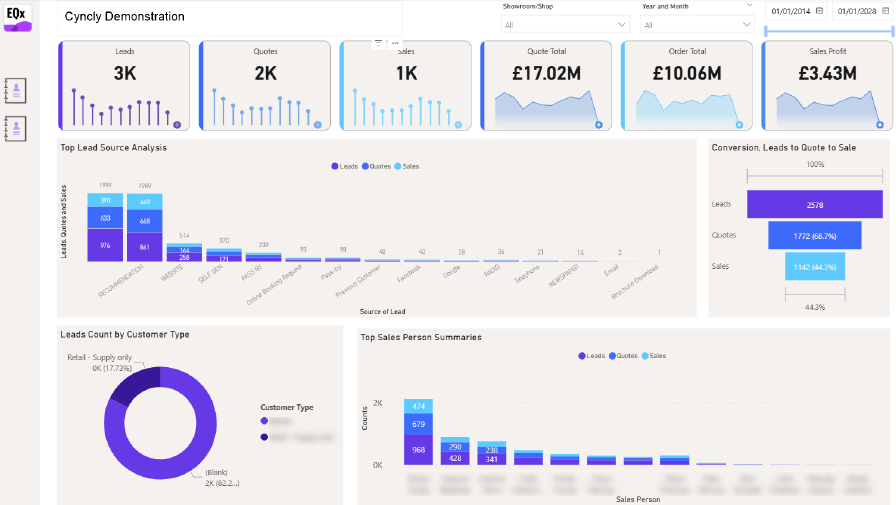 - Interactive dashboards across leads, quotes, sales, and purchasing